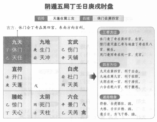 庚戌 蓬三,休四。宿吉干凶。休巽义,惊丁艮和,死坎制欢怡。天四,地九,阴一,合六。休与星合四东南,符勃,壬干勃,虎猖狂,飞符,时干离,壬日勃,壬日飞干格,大格。