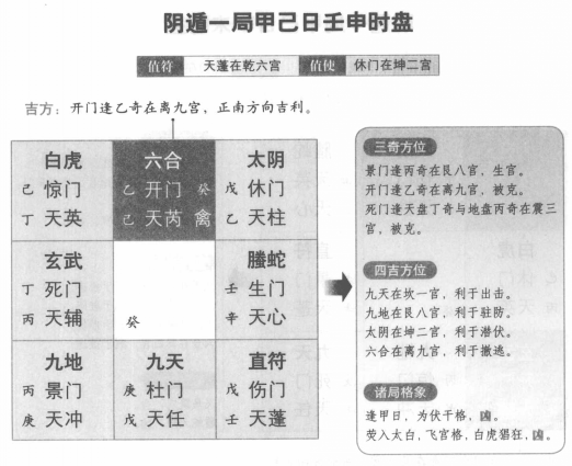 壬申蓬六,休二。宿吉干区,地道。景良义,开离害,死丙震害。天一,地八,阴二,合九。开与日合九正南,甲日伏干格,时干兑,火入金,飞宫,格,虎狂。