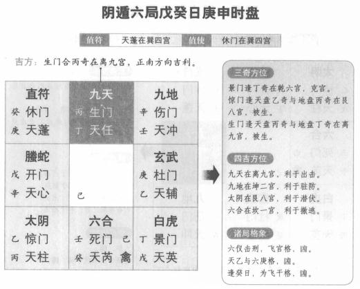 符使宫位:值符天蓬星在巽四宫,值使休门在巽四宫。时干遇吉星宿,时干逢凶。