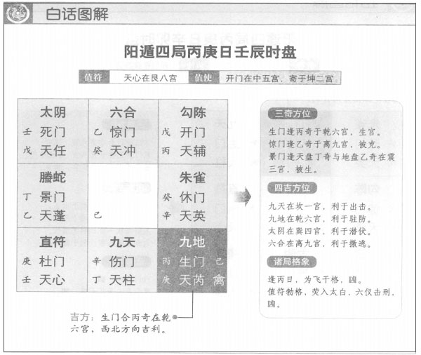 三奇方位:生门逢丙奇在乾六宫,生宫,丙奇入墓。惊门逢乙奇在离九宫,被克。景门逢天盘丁奇与地盘乙奇在震三宫,被生。